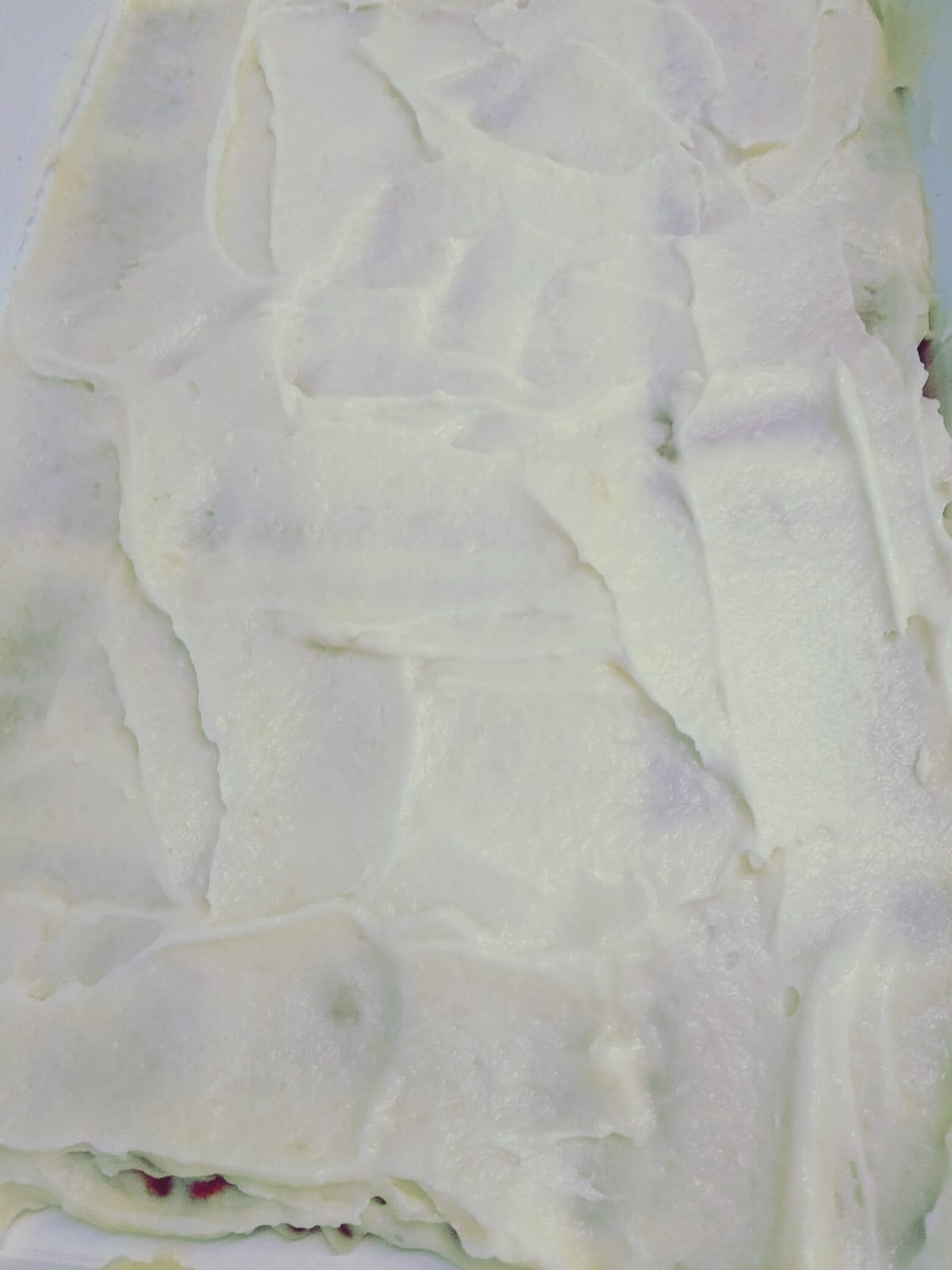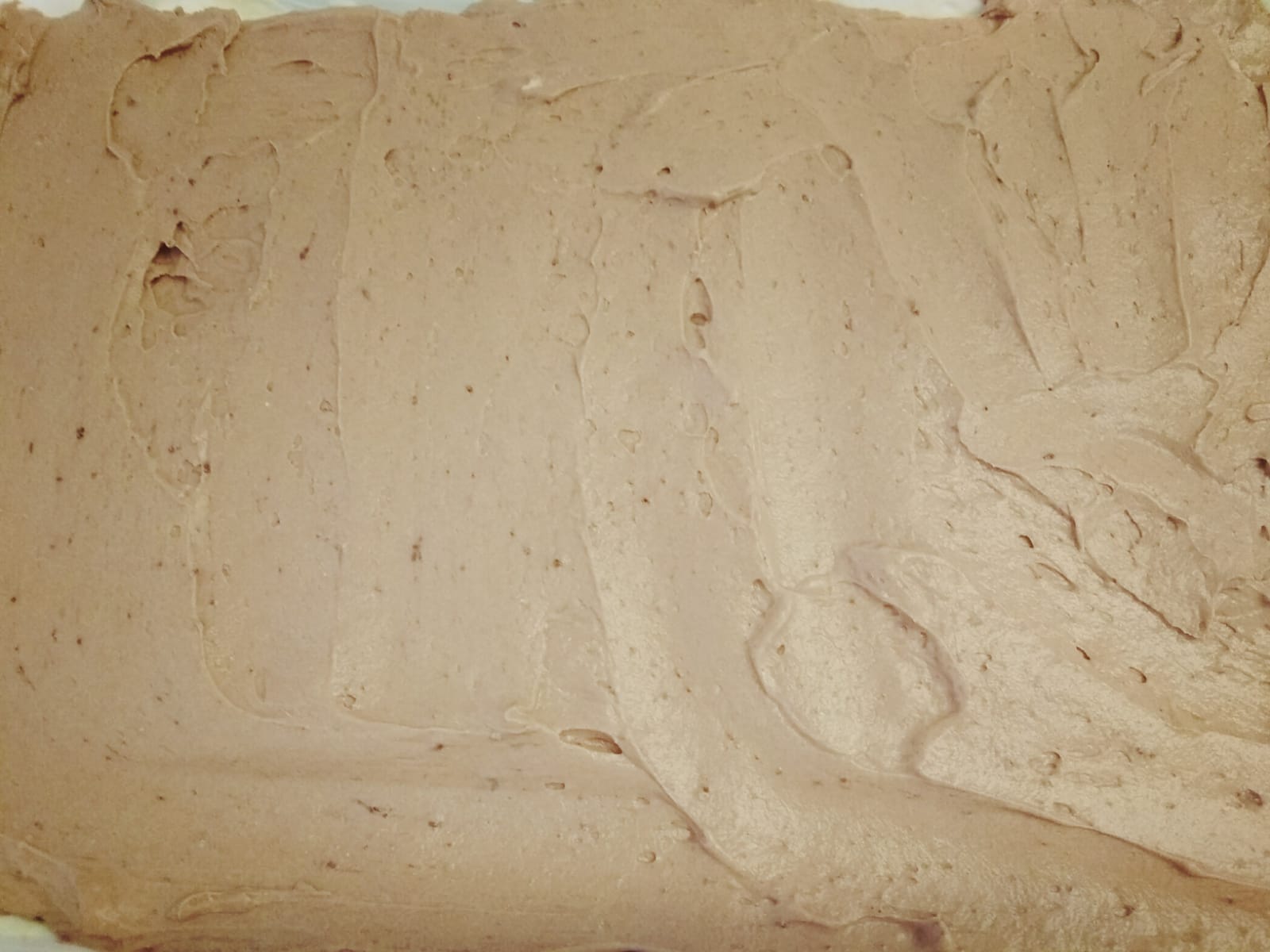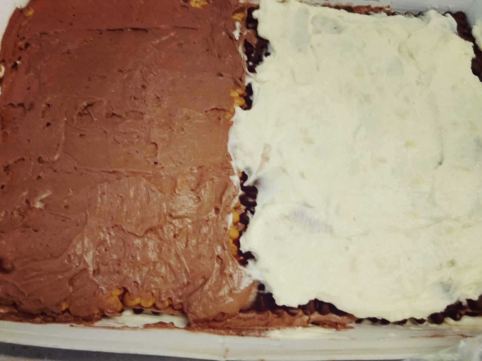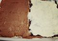 6. מורחים את מילוי השוקולד מעל הבסקוויטים החומים וכך הלאה (אני החלטתי לשים בשכבה האחרונה חצי מילוי וניל וחצי מילוי שוקולד) – כך שיוצאת לנו עוגה בכמה צבעים.