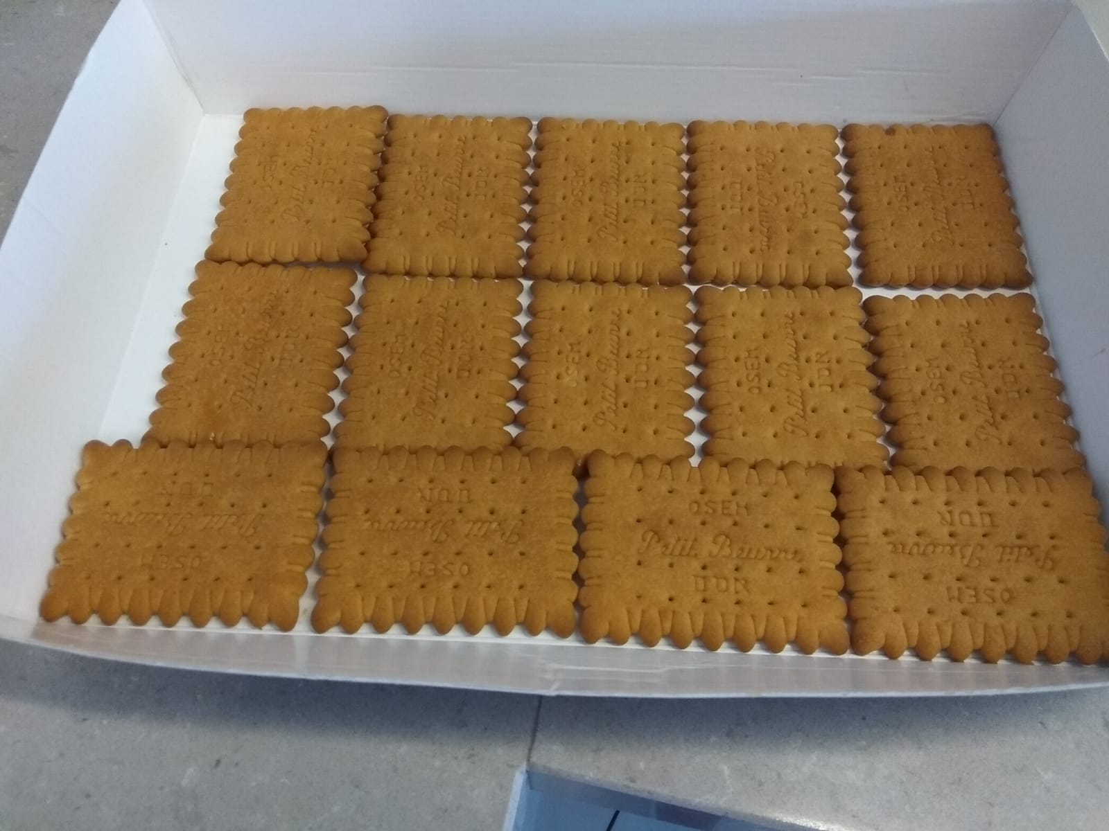 5. והנה הטוויטס : מרטיבים את הבסקוויטים החומים בקפה ומסדרים מעל המילוי הלבן .