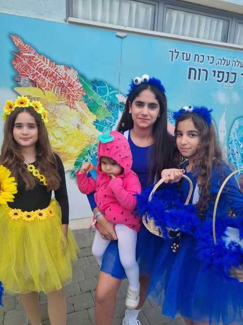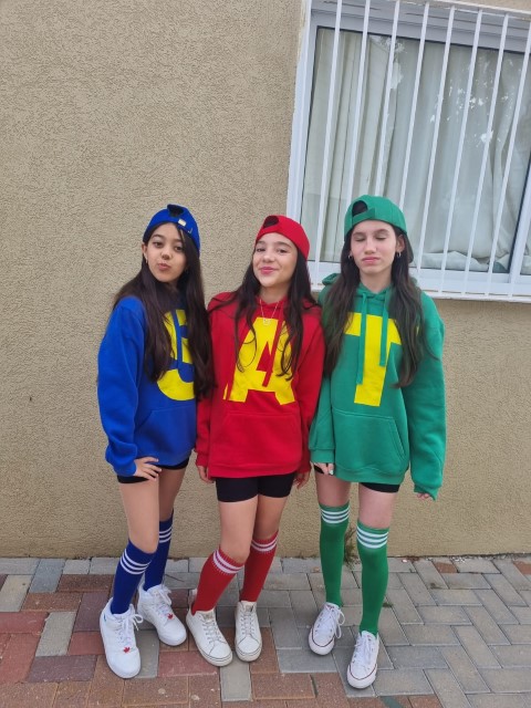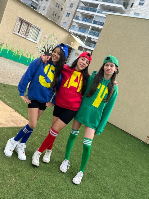 עדי, ליה ויובל מו'3: "התחפשנו לפיראטיות וראפרית. ראינו תמונה של פיראטיות וממש אהבנו. אז אספנו רעיונות עד שיצרנו את התחפושת הזו". חיים השומר: "כיף לראות את הילדים שמחים למרות המצב. זה חשוב בשביל הילדים".